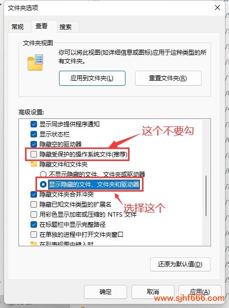 5.在“高级设置”中,取消勾选《隐藏受保护的操作系统文件》,并选择《显示隐藏的文件,文件夹和驱动器》,点击“应用”和“确定”按钮,即可永久显示隐藏文件。