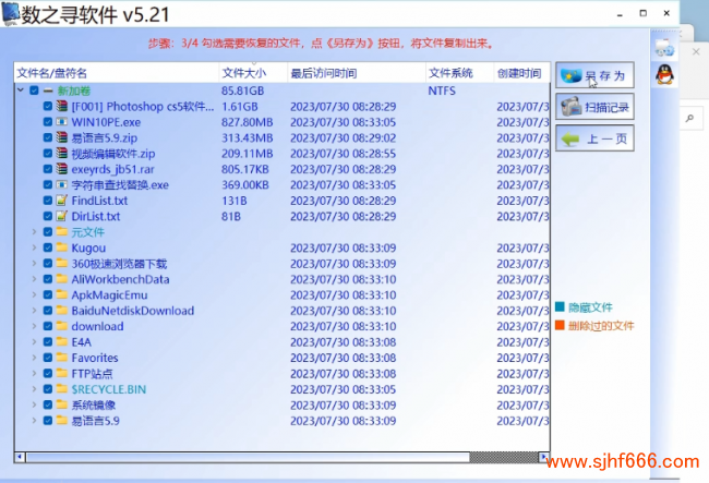 步骤3:勾上所有需要恢复的文件,然后点右上角的《另存为》按钮,将勾上的文件拷贝出来。