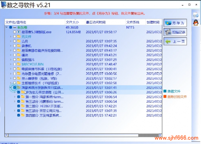 现在在程序里,可以直接看到电脑中无权访问的目录里面的文件名都是正常的了。将要恢复的数据打钩,然后点右上角的保存,《另存为》按钮,将打钩的文件复制出来。