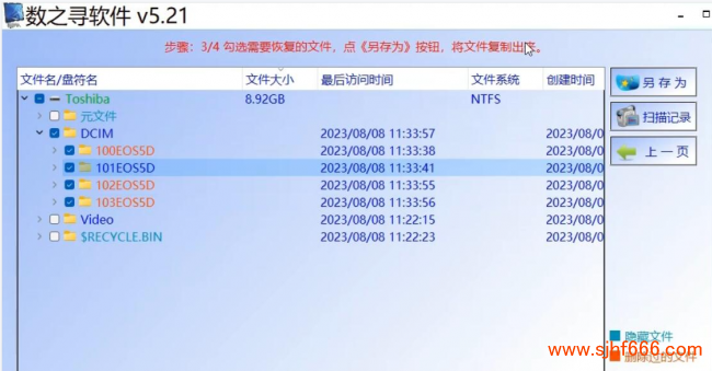 步骤3:现在在软件里, 误删除数据的文件名都是正常的了。将需要恢复的数据勾上,然后点右上角的保存,《另存为》按钮,将勾上的文件拷贝出来。